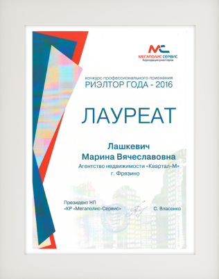 Лауреат регионального конкурса профессионального признания “Звезда Подмосковья – 2016” в номинации “Лучший специалист по недвижимости Московской области -2016"